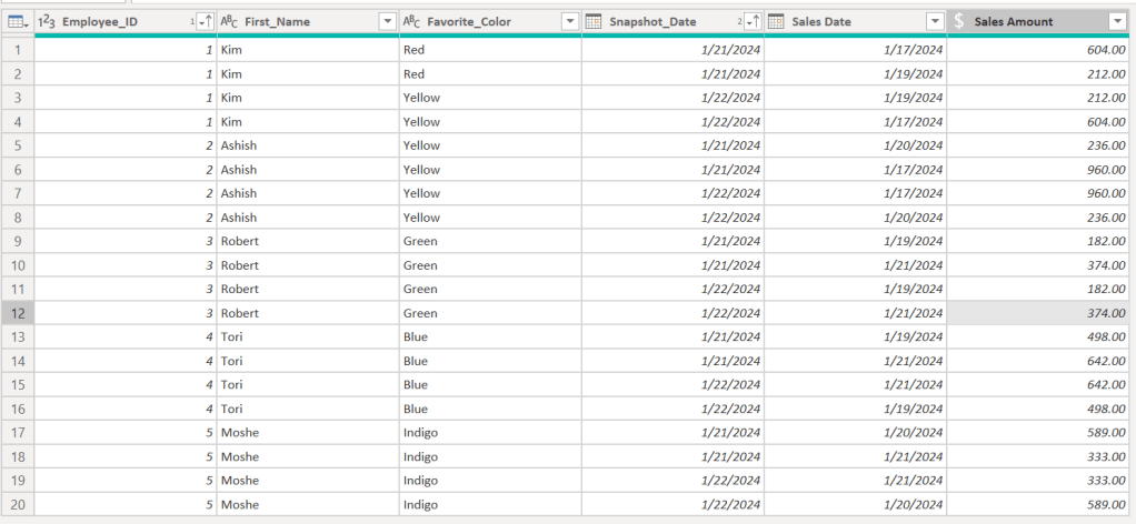 The new _SKey_Employee column has one unique value for each combination of Employee_ID and Snapshot_Date. Now, when creating any fact table that needs to have a relationship with the employee dimension, you can bring the _SKey_Employee into the fact by joining on both the Employee_ID and Snapshot_Date.