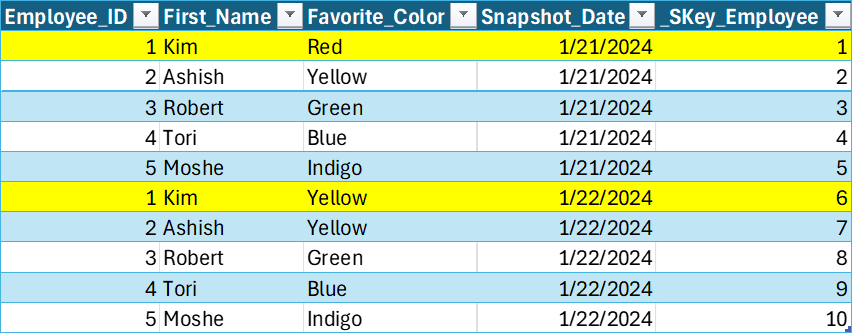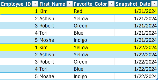 We have captured the changed value for Kim’s favorite color, but the Employee_ID is no longer unique and can’t serve as the primary key.
