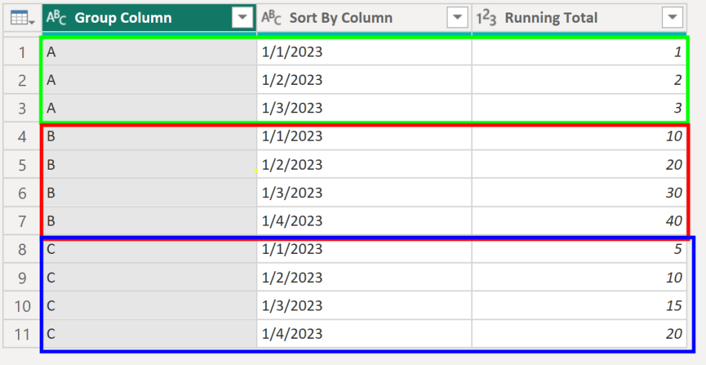 Let’s say you start with the following table which columns a cumulative column called “Running Total” grouped by a column called “Group Column” and sorted by a column called “Sort by Column”: