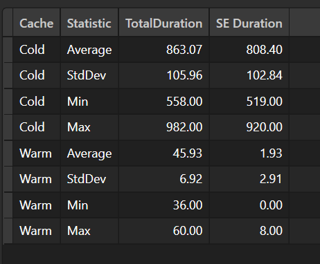 When using the cache (warm), the SE duration is close to 0 but there is still a decent amount of formula engine time remaining (TotalDuration – SE Duration).