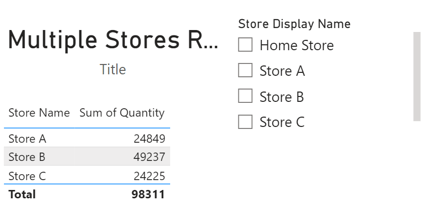 Since each Store Name value will be the user’s home store when filtering the Store Display Name to be equal to “Home Store,” we can add a slicer to the report filtering the Store Display Name to be equal to “Home Store.”