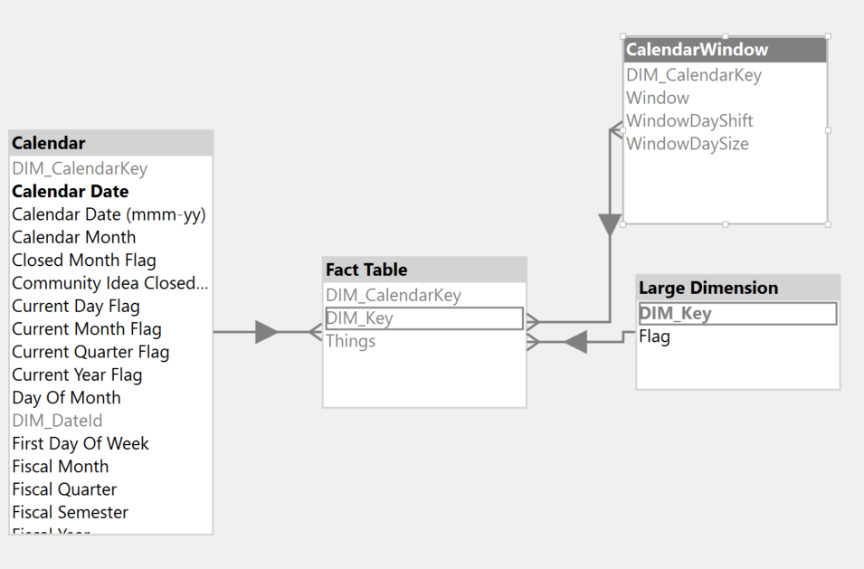 After the CalendarWindow table has been created, create a many-to-many relationship between the new table and your fact table: