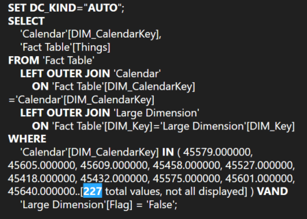 The first pattern we had was a simple 28-day rolling distinct count on the column “Things” using DATESINPERIOD. We wanted to display the trend of this calculation over the past 6 months with a filter applied to the ‘Large Dimension’ table.