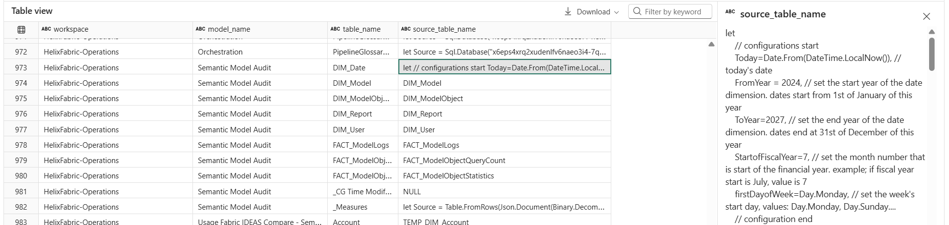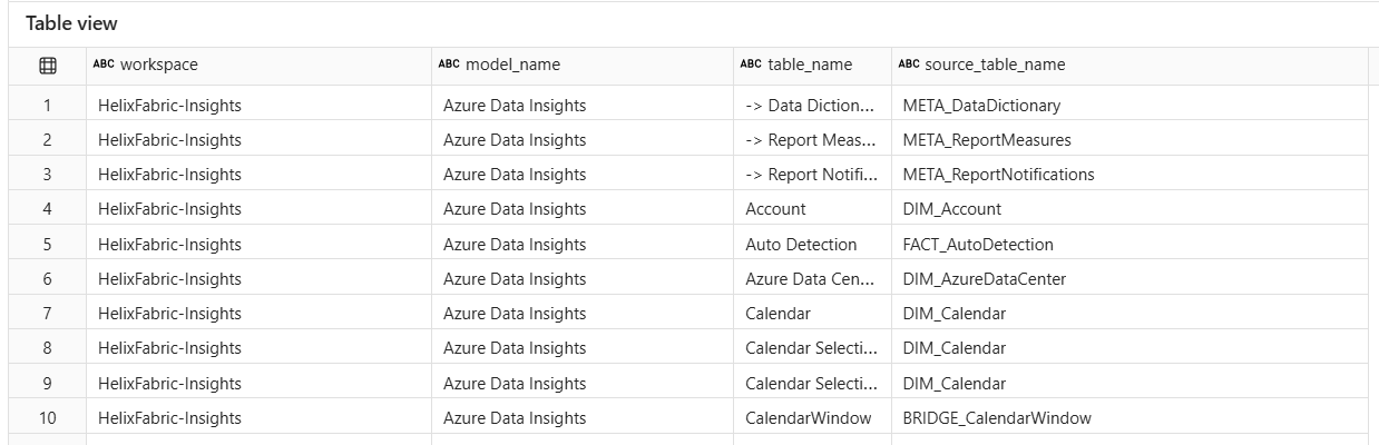 As you can see here, many of the tables' M expressions had a matching pattern and the notebook was able to successfully extract the source table name. A few didn't have any matches, like the DIM_Date table which doesn't pull from an external source but is completely built in M.