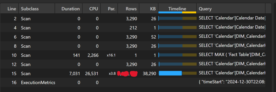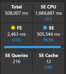The query is quite slow, taking a staggering 508 seconds to complete. Taking a look at the server timings, there are a total of 216 storage engine queries, mostly representing one query for each day's 28-day distinct count over the past 6 months.