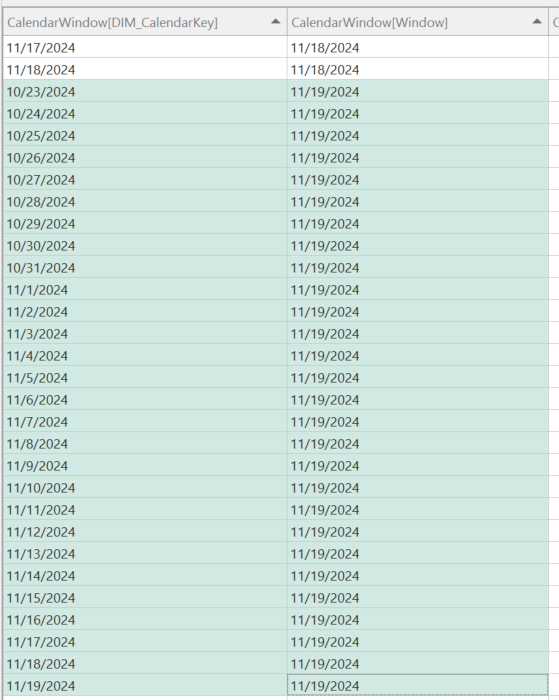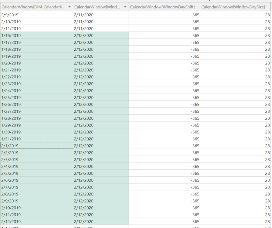 I have also added some additional columns: WindowDaySize and WindowDayShift. The WindowDaySize allows you to have more than one window size to slice your data by, e.g. 28-days, 7-days, etc. The WindowDayShift allows you to perform easier time intelligence with the CalendarWindow table. For example, if I want to get the rolling 28-day window for last year, I can filter the CalendarWindow table where WindowDaySize = 28 and WindowDayShift = -365 as shown below: