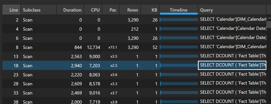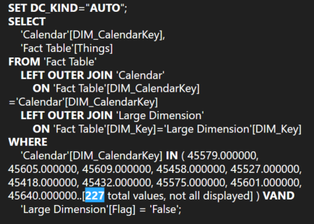 By changing this one line, we see a significant improvement in performance. The total duration went from 508 seconds to just 49 seconds. As you can see below, the majority of the processing is performed by the formula engine and there is now a large materialization of combinations of Things and days in one storage engine query.