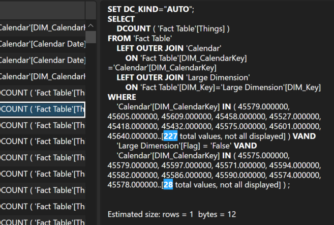 The first pattern we had was a simple 28-day rolling distinct count on the column "Things" using DATESINPERIOD. We wanted to display the trend of this calculation over the past 6 months with a filter applied to the 'Large Dimension' table.
