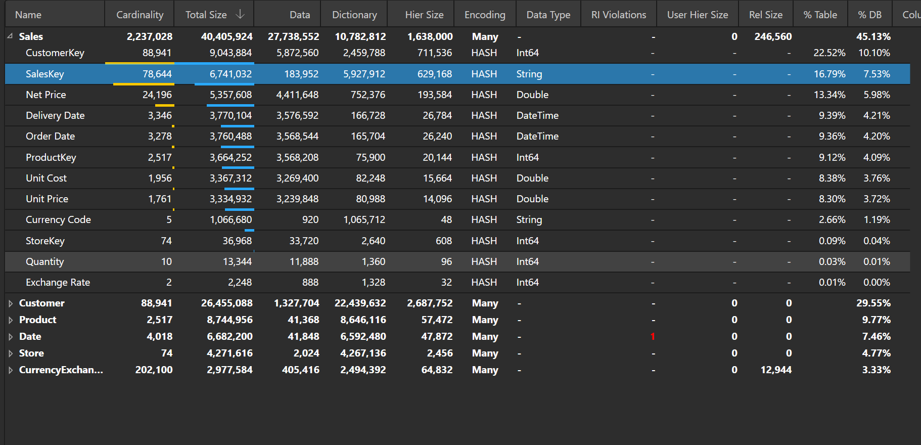 By drastically reducing the cardinality of the SalesKey column, the column takes up much less memory (from 94.94 MB to 6.74 MB), and the model size has been drastically reduced (from 168.42 MB to 85.39 MB).