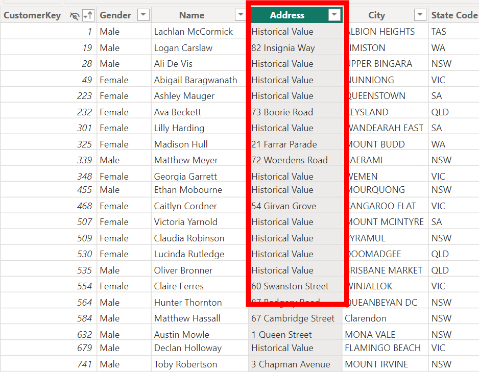 To replace the address information for old customers, we can get the list of customer keys that only have sales before 2020-03-01 (the current month in the dataset). Then we can replace all the address information for those keys with a default value.