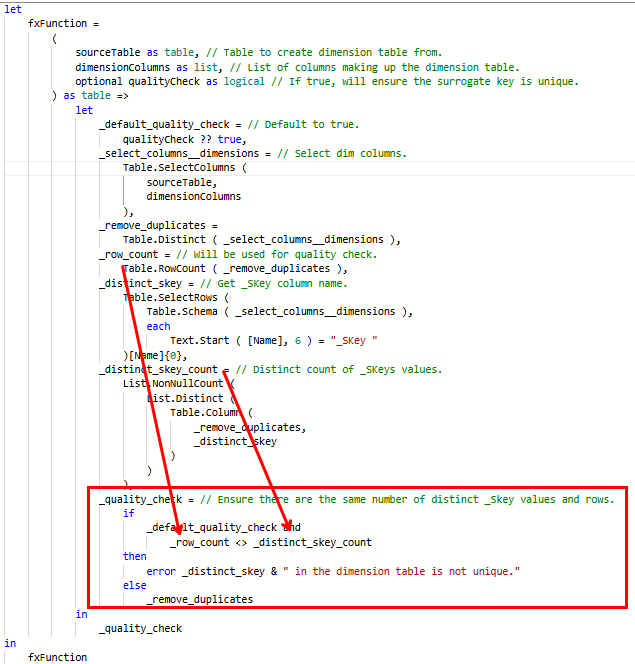 The basic logic is: select the dimension columns from a table (including the surrogate key) and perform a Table.Distinct on the entire table.