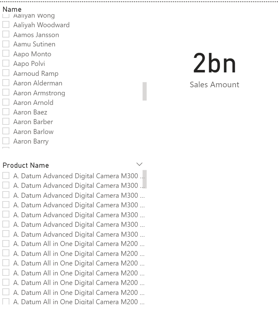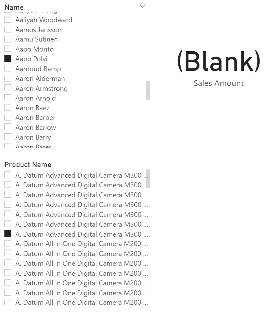 This occurs because the filter is not passed from the Customer table to the Product table, resulting in the user having to randomly select values from the second slicer hoping to find a valid selection (talk about a terrible user experience).